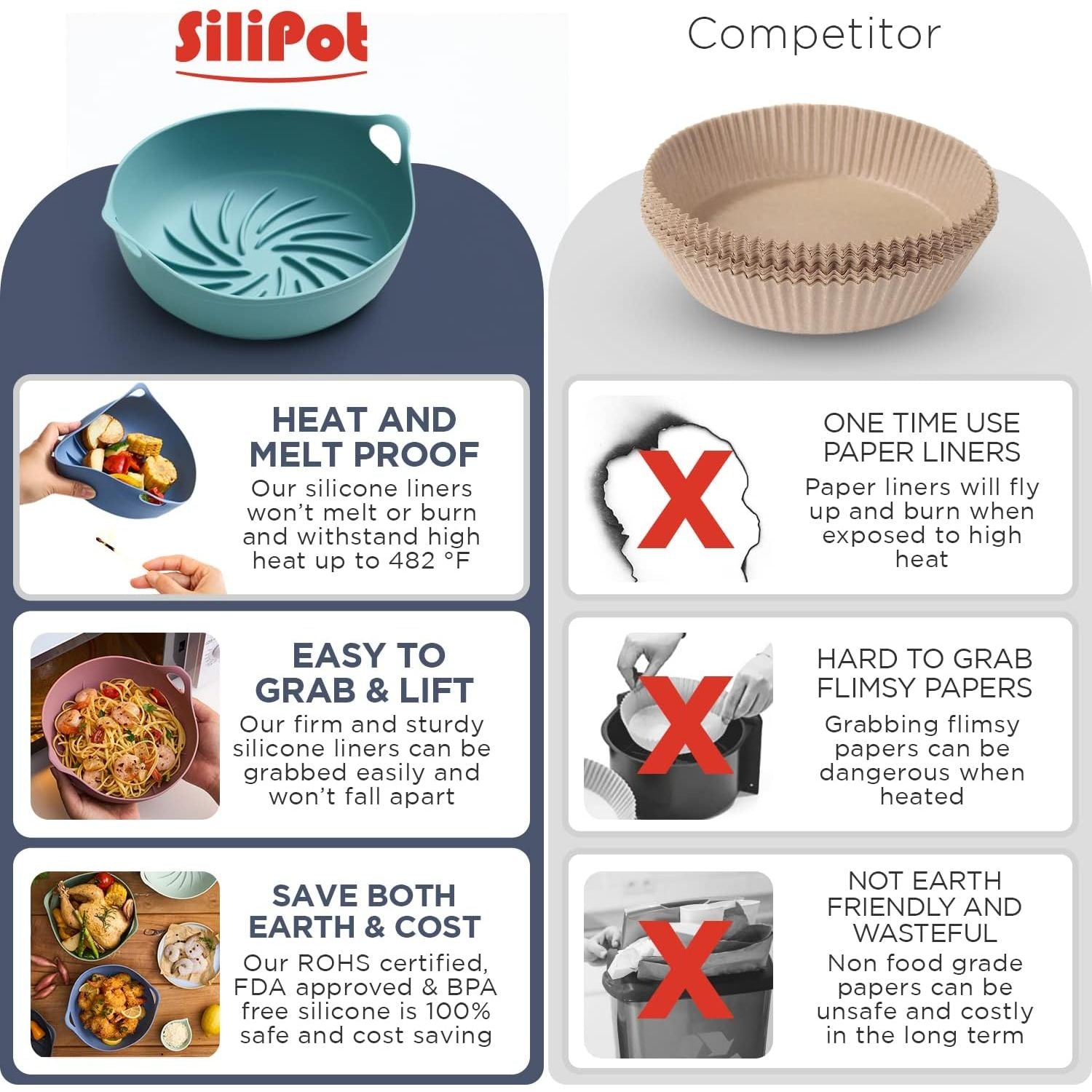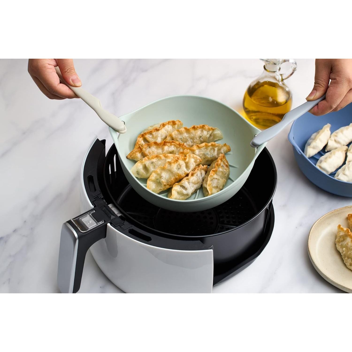 The Silipot Air Fryer Silicone Basket for a food-safe silicone liner designed to fit standard air fryer baskets — keeps food from sticking to the basket, makes cleanup easy, and is reusable and dishwasher-safe.