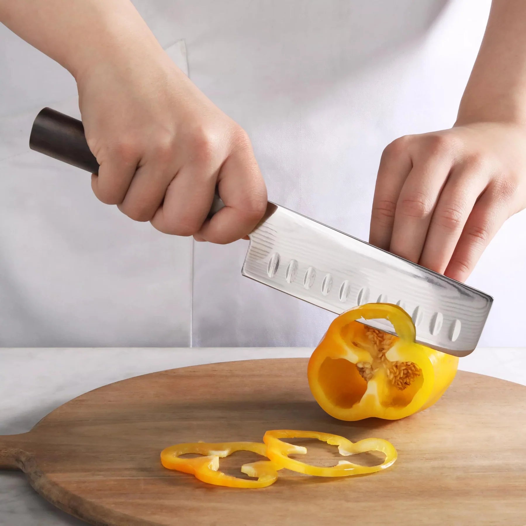 The 7-inch Santoku Knife is a Japanese-style chef’s knife for slicing and chopping fruits, vegetables, and meats. This highly versatile blade features a hollow edge, which reduces surface resistance while cutting and allows food to easily slide off the blade’s surface.