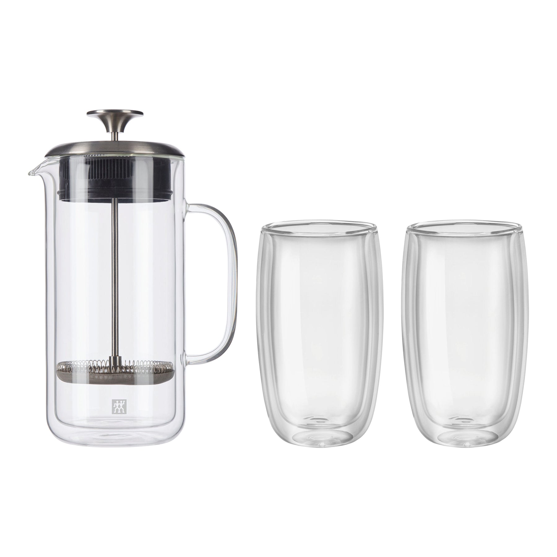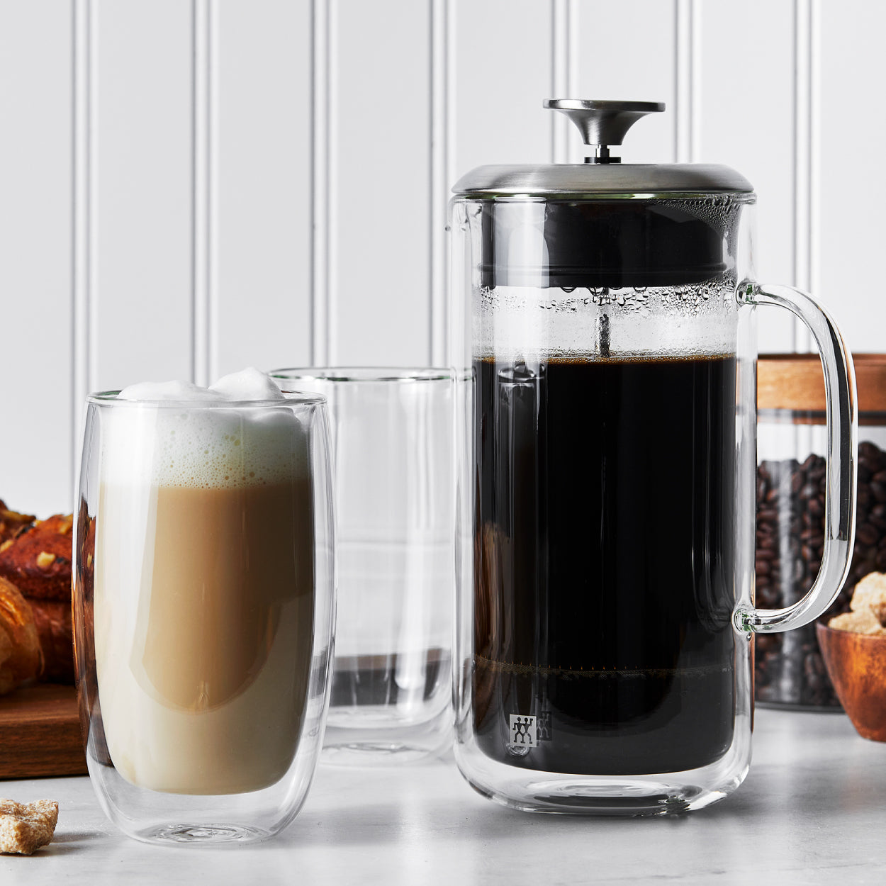 The 3-piece French Press and Latte Glass Set lets you brew and enjoy the perfect cup of coffee. These elegant and sophisticated double wall glasses maintain the toasty temperature of lattes and other hot beverages while remaining cool to the touch. And cold drinks, such as iced lattes, stay chilled without leaving messy condensation rings on the table. They are truly as beautiful as they are functional.