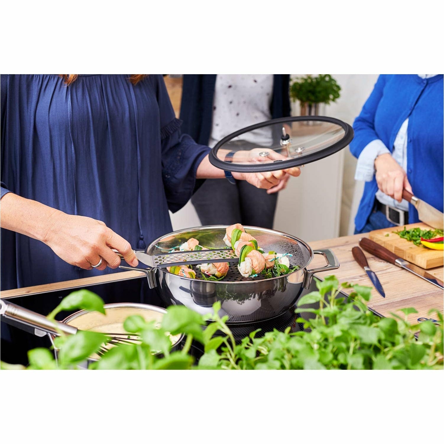 The saucepan is a cornerstone of the kitchen, perfect for preparing sauces and side dishes. The self-sealing lid locks in moisture, while a relief vent releases steam to prevent boil-over. Laser-etched interior capacity markings make measuring easy.