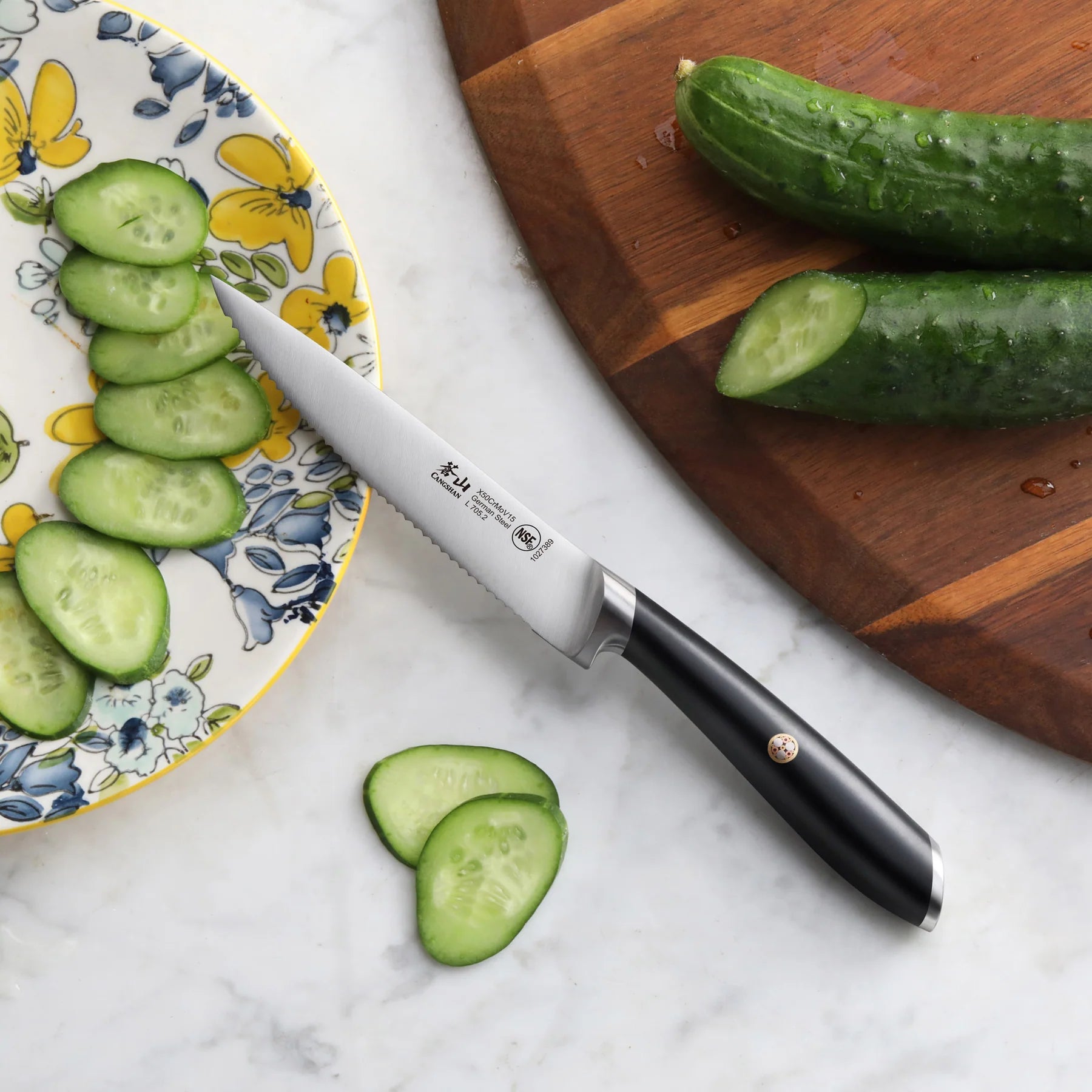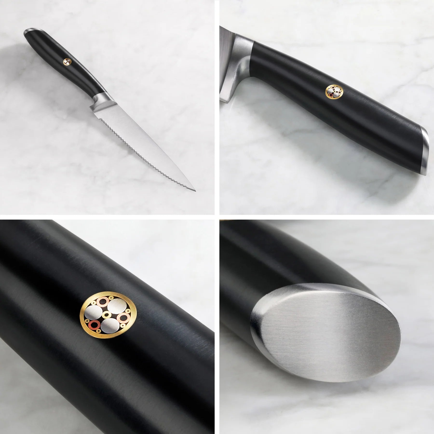 The 5-inch Serrated Utility Knife is an everyday essential, designed to cleanly slice anything from bagels and crusty breads to cured meats or tough-skinned fruits and vegetables. The serrations pierce the exterior of the food and slice through with very little pressure needed, preventing your cut from crushing even the most delicate foods like fresh, ripe tomatoes.