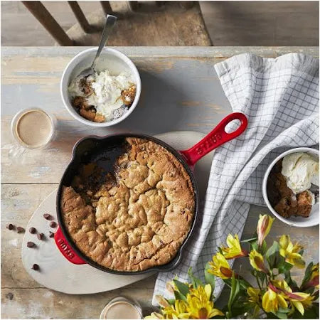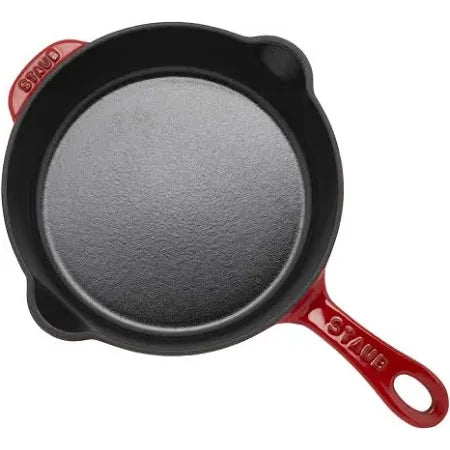 Regular price $179.99 Sale price $99.99 Save $80.00Combining the best features of a sauté pan and a fry pan, this Staub skillet has high, straight sides that reduce splatters on the stovetop. Everything from cornbread and biscuits to fruit cobblers cook to golden perfection in the deep cast-iron pan. The textured enamel interior enables exceptional browning without sticking – ideal for searing meat, frying bacon and caramelizing onions.