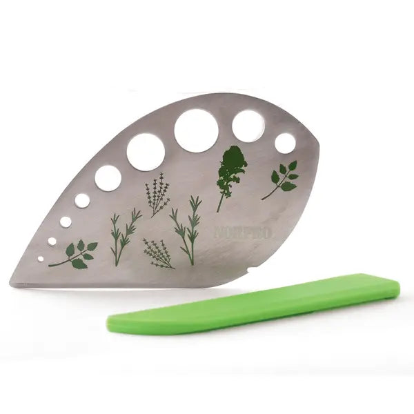 Multiple sized holes to fit a variety of herbs and leafy greens; kale, chard, collard greens rosemary, oregano, thyme, parsley, tarragon and more. Place stem into the smallest hole it will fit and pull through to strip the leaves off in a fraction of time. Blade edge chops herbs or strips the leaves right into your pan or dish. Use more of the plant for less waste. The Norpro Stainless Steel Herb Stripper/Chopper is made of durable stainless steel, ensuring long-lasting use. It measures 4.75" x 2.88" x .125" / 11.5cm x 7cm x .3cm, making it compact and easy to store. The chopper also comes with a protective cover for the blade, ensuring safe storage. Additionally, it is easy to clean, making it convenient to use for all your herb-stripping and chopping needs.